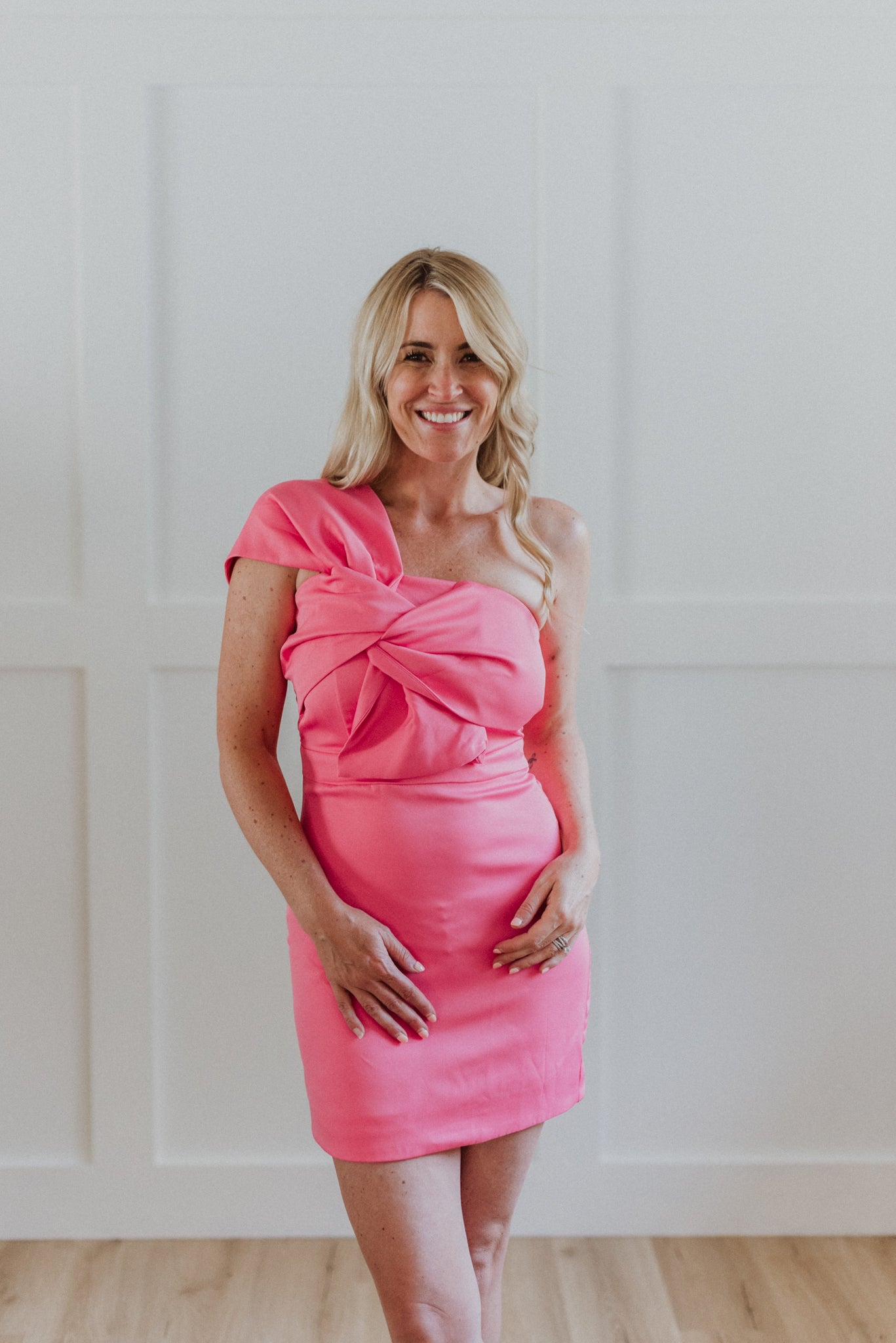 This one shoulder dress features a mini skirt, back zip, and stretchy in hot pink fabrication for a fun summer cocktail attire. The one shoulder and wrap bow detail add a fun but elegant touch to the dress, making it a must-have for any wardrobe. Perfect for any occasion, this dress is sure to impress.