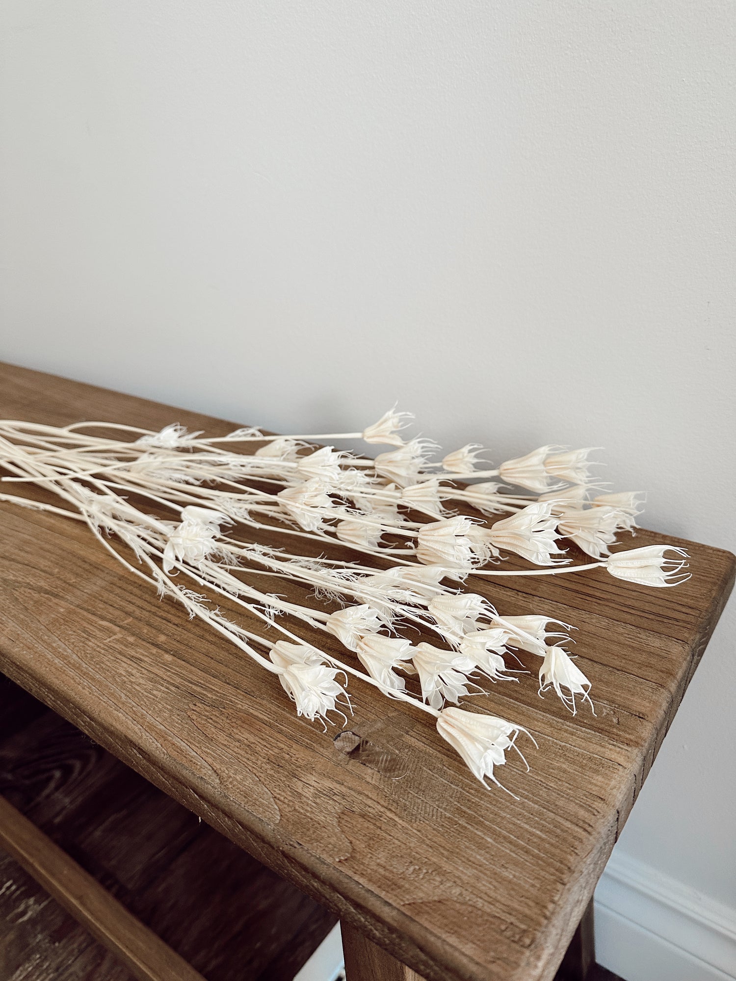 The nigella-dried flower resembles a delicate bell. The various stem heights and textures will encourage dimension in your floral arrangement.