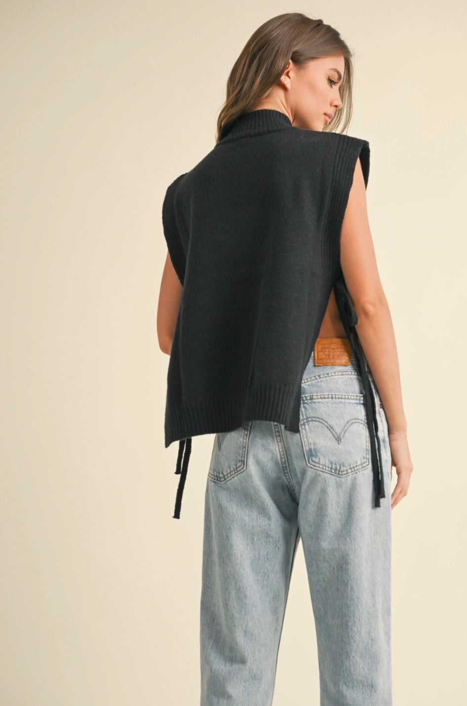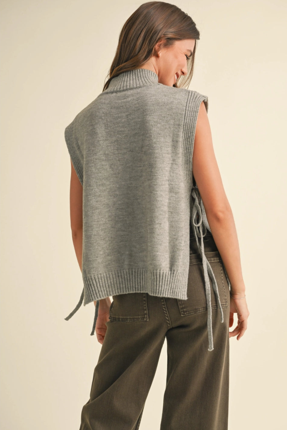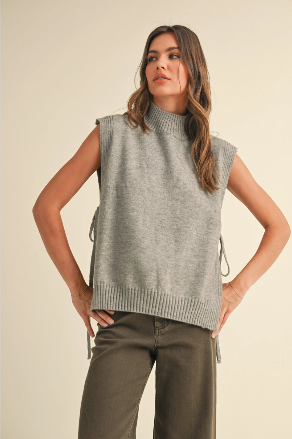 This playful side tie sweater vest features open sides and a mock neck for a comfortable and cozy fit. The knit fabric is so soft, and special details add a touch of charm. Perfect for adding some fun to your fall wardrobe!