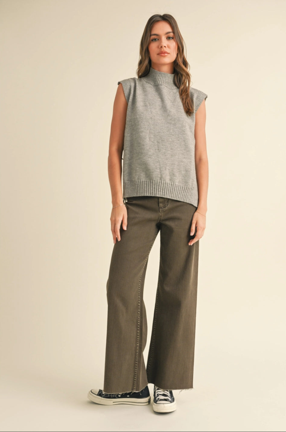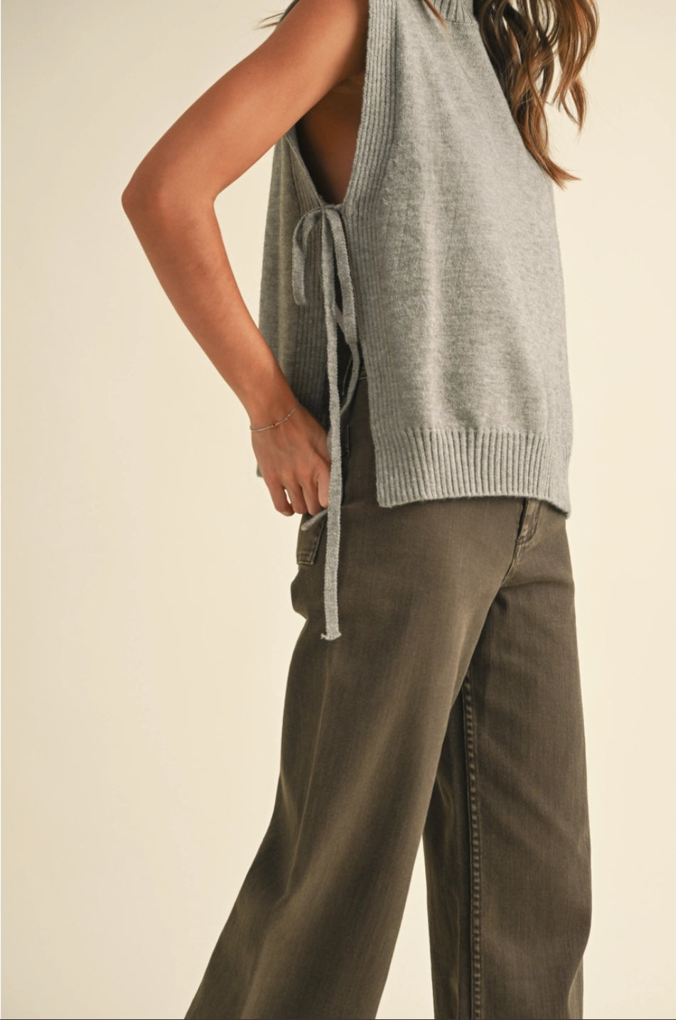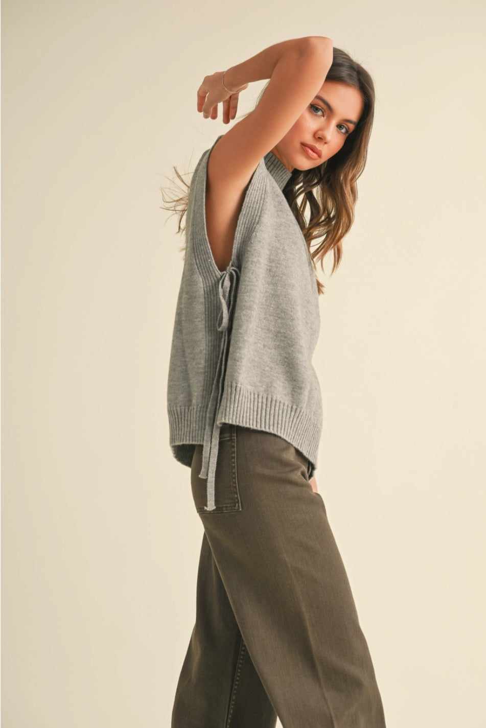 This playful side tie sweater vest features open sides and a mock neck for a comfortable and cozy fit. The knit fabric is so soft, and special details add a touch of charm. Perfect for adding some fun to your fall wardrobe!