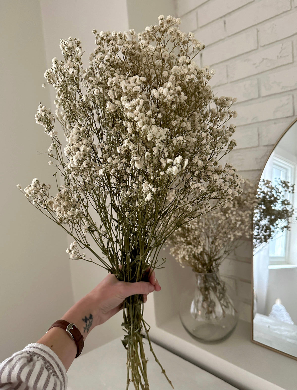Give a whimsical look to your vase or bouquet! This baby’s breath bundle offers a soft off-white hue perfect for a layering warm and cozy whites in your room. No green thumb required - this bundle will last you forever to rough it’s naturally preserved process.