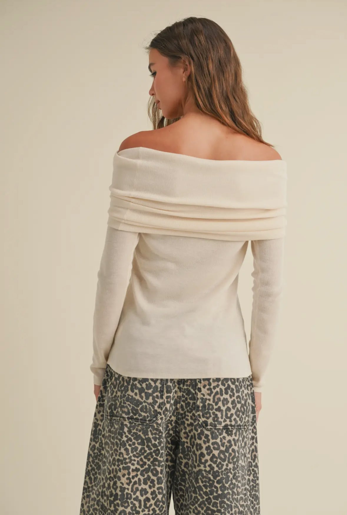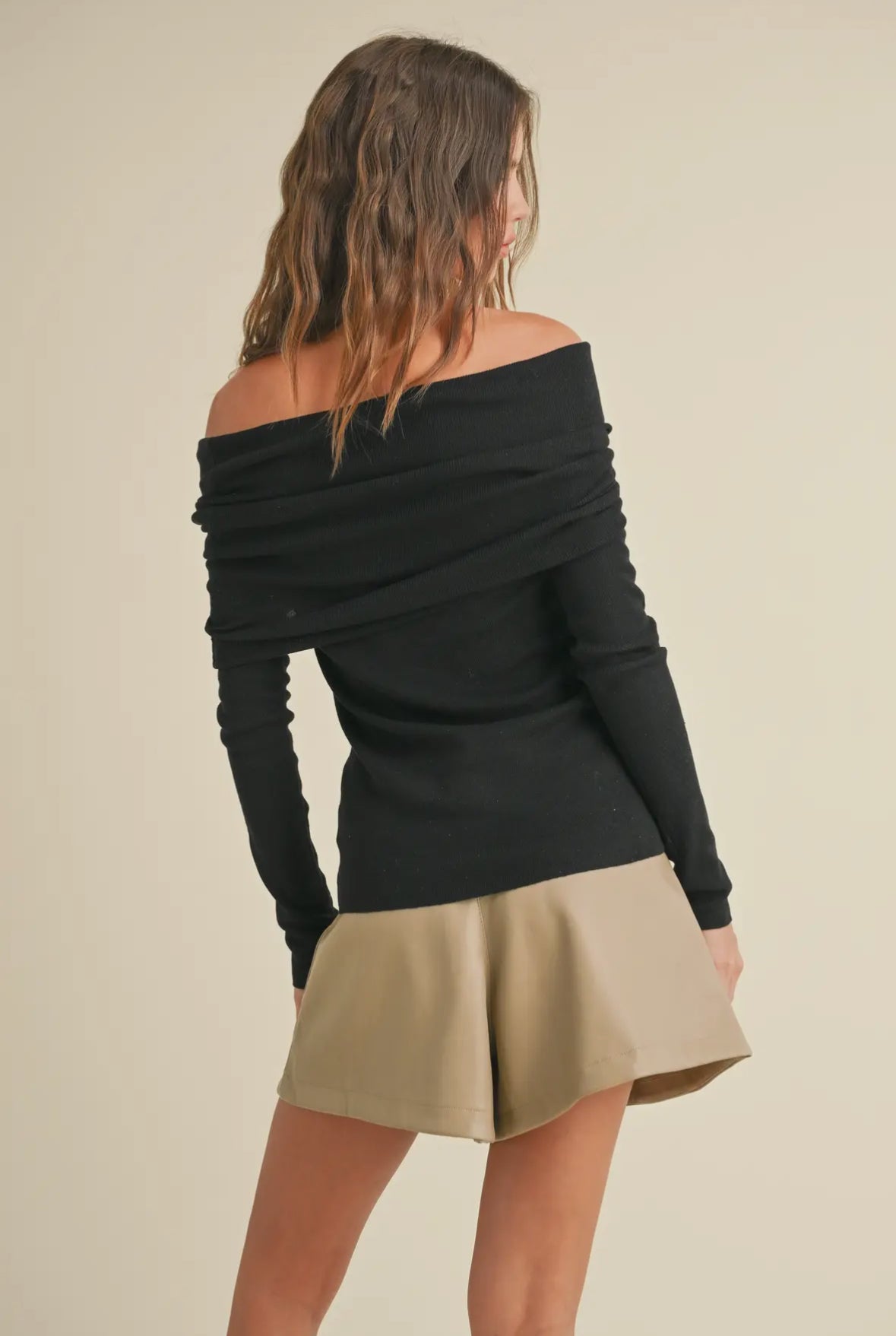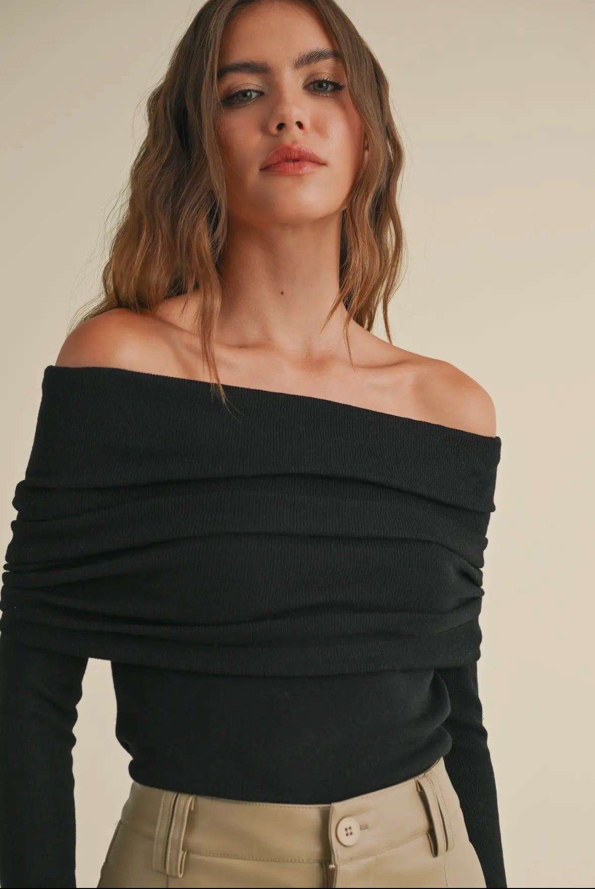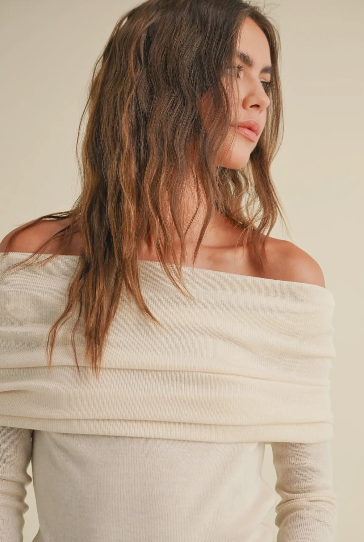 This elegant off the shoulder sweater top features a stretchy and timeless wool blend fabrication, perfect for a classic and elegant silhouette. A versatile addition to any wardrobe, it adds a touch of sophistication and can be dressed up or down for any occasion. Available in cream or black for a sleek and chic look.