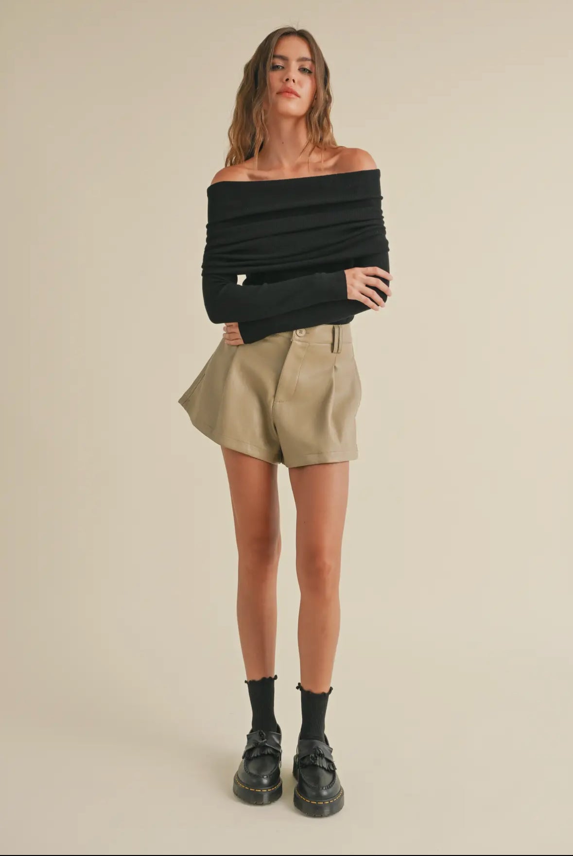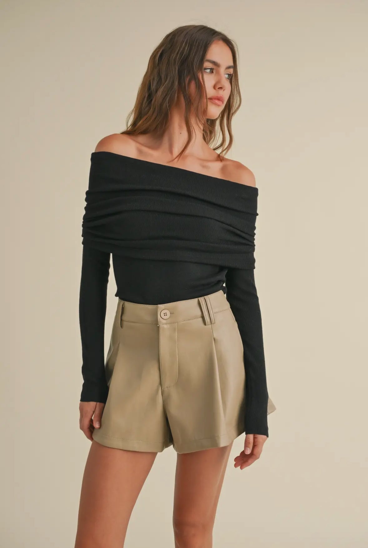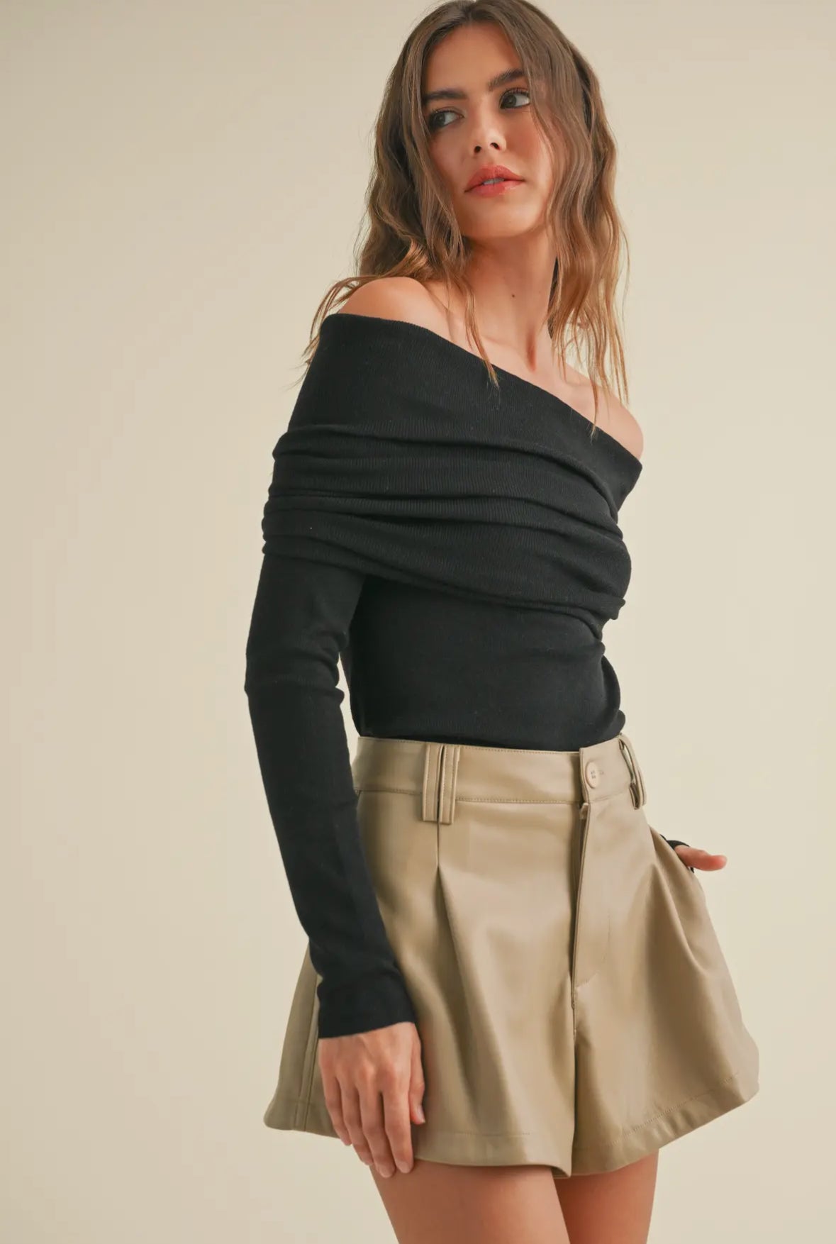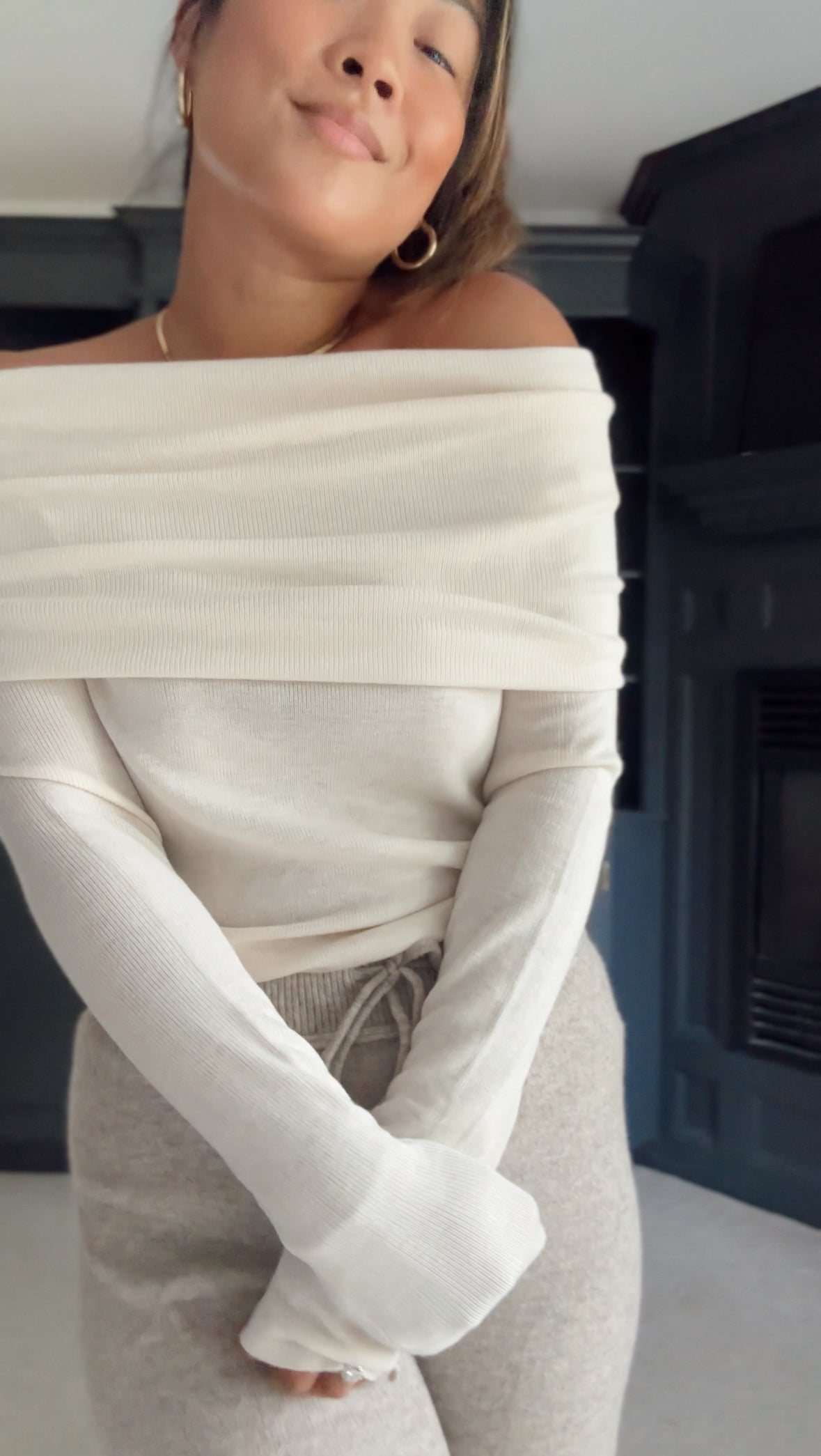 This elegant off the shoulder sweater top features a stretchy and timeless wool blend fabrication, perfect for a classic and elegant silhouette. A versatile addition to any wardrobe, it adds a touch of sophistication and can be dressed up or down for any occasion. Available in cream or black for a sleek and chic look.