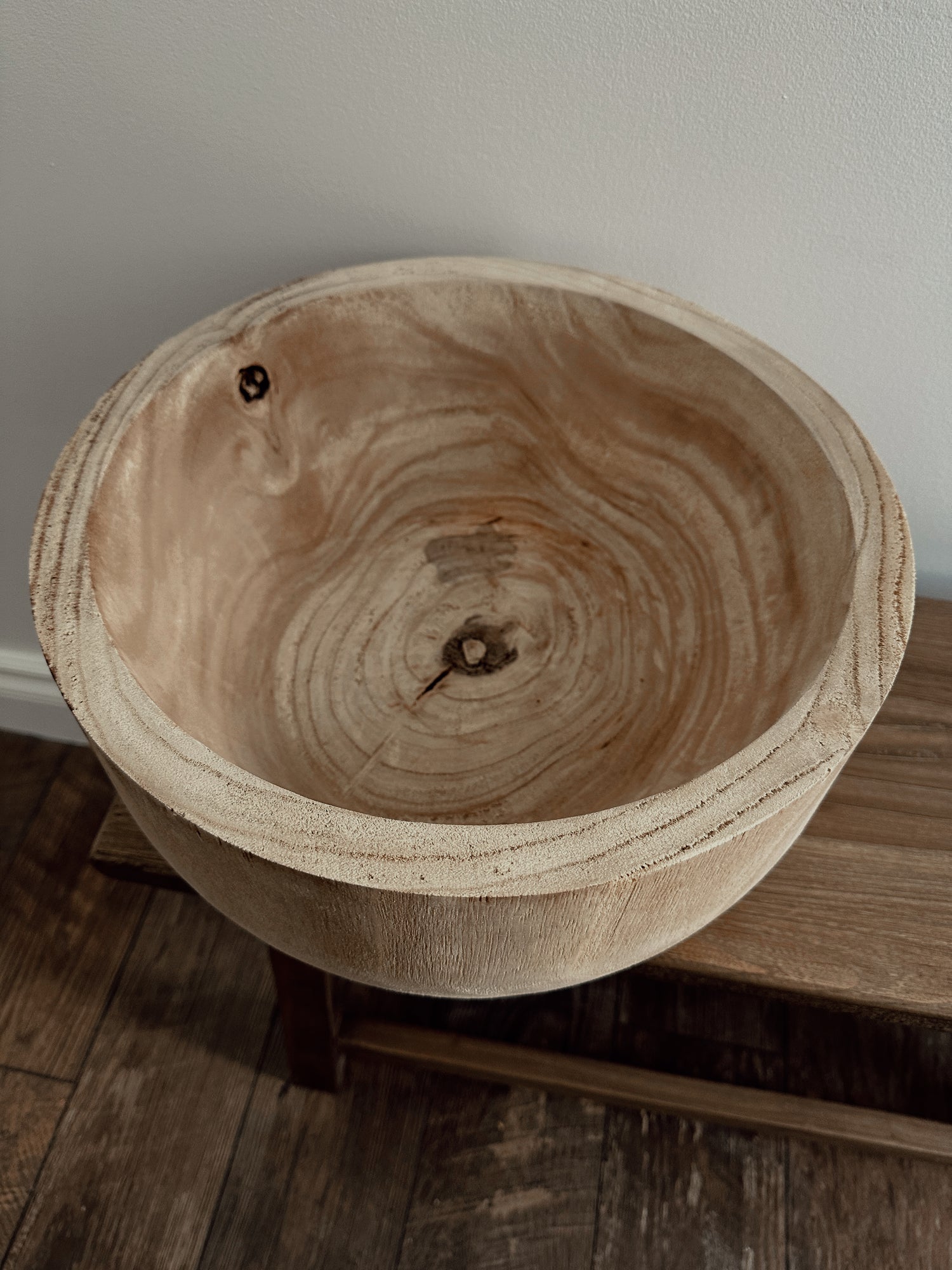 This extra-large, hand-carved bowl made from Paulownia wood that is very light in color and perfectly matches a lighter coastal design theme. This round bowl has an open, shallow design in this collection for when you want to more easily display whatever you are housing in there.