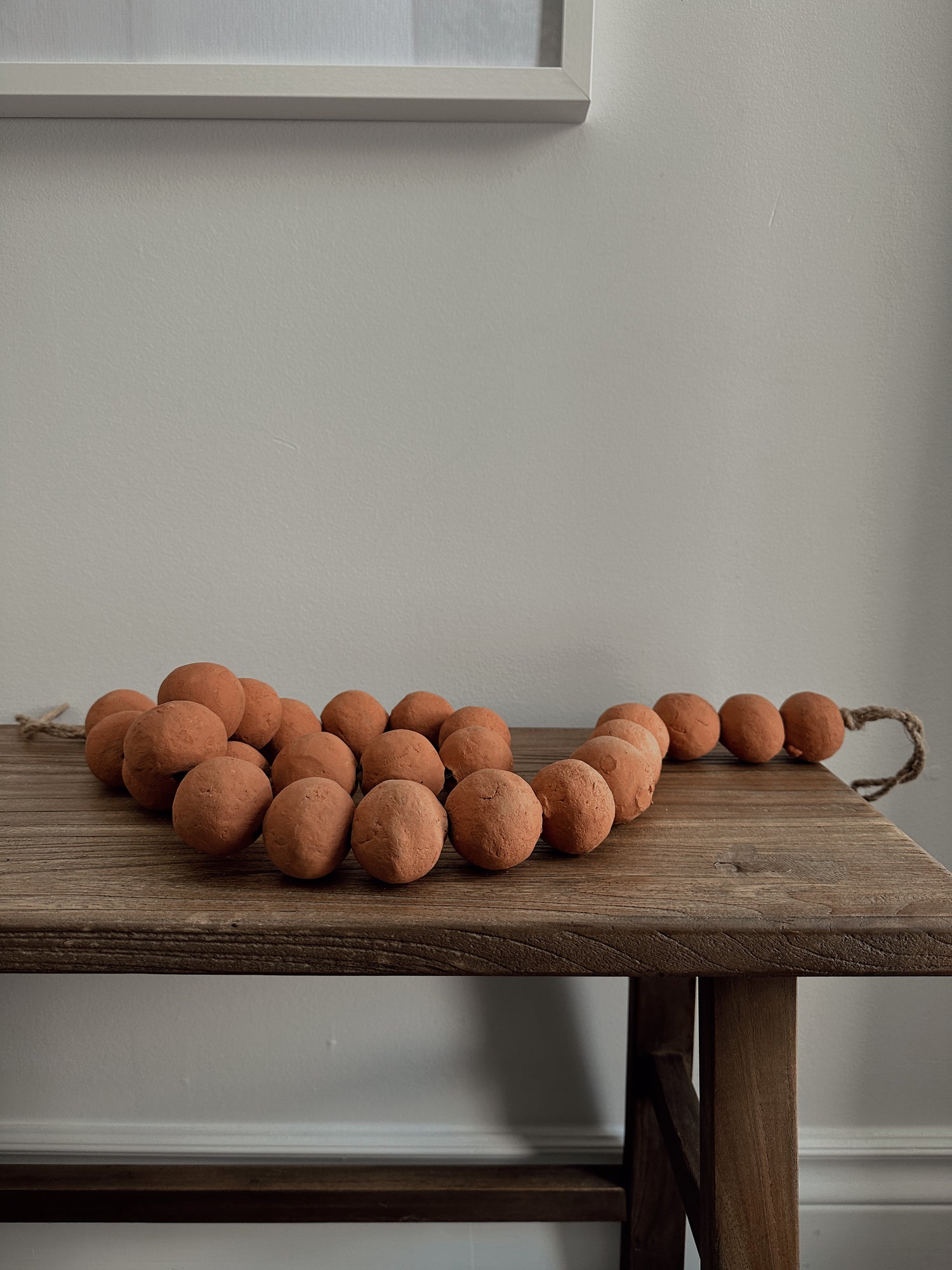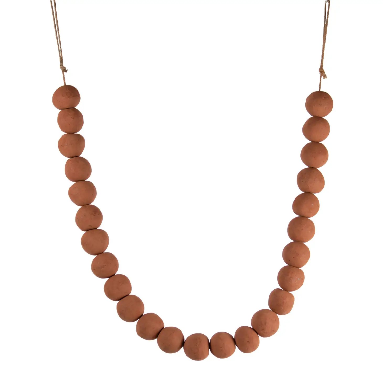 The perfect way to infuse a natural element to your decor, this terracotta bead garland will make a statement in your home. Each bead is hand formed by artisans in India, and hand strung onto a jute cord making each one unique and special. This garland could be used on a coffee table, sideboard tablescape, intertwine with faux greens, pair with natural deco balls in a bowl.